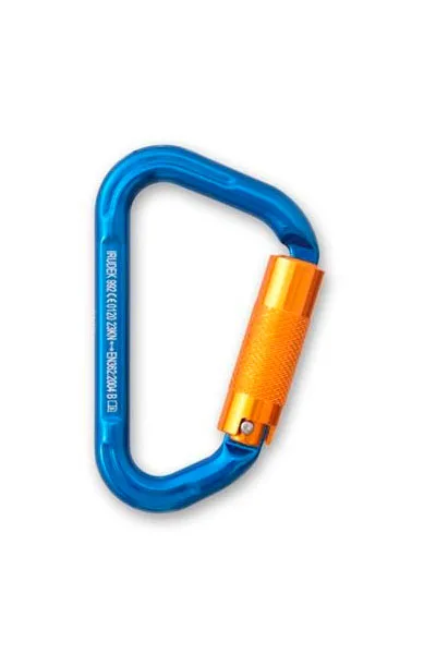 Mosquetón de aluminio con cierre manual de rosca screw lock y número de serie individual.